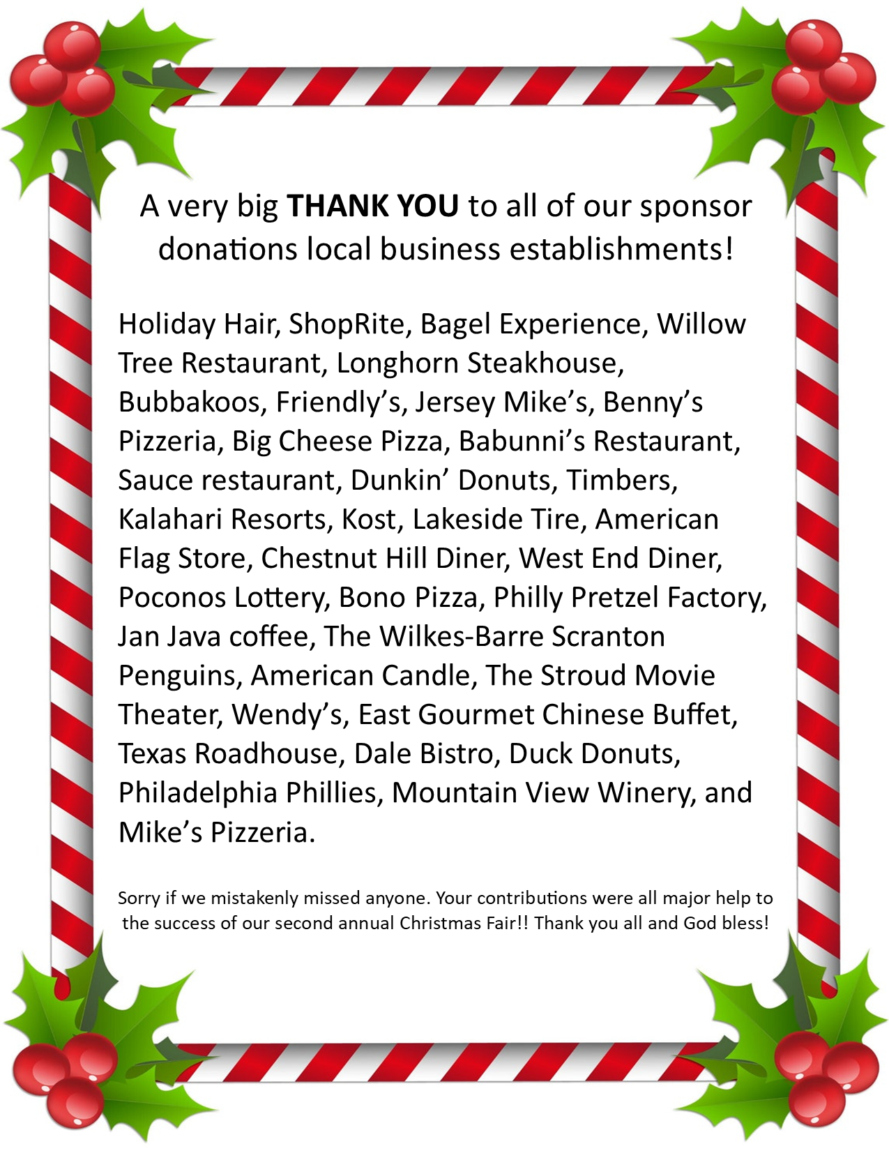 A big THANK YOU to everyone who helped make our second annual Christmas Fair a success! Click HERE for a list of local sponsors, be sure to give them your support!